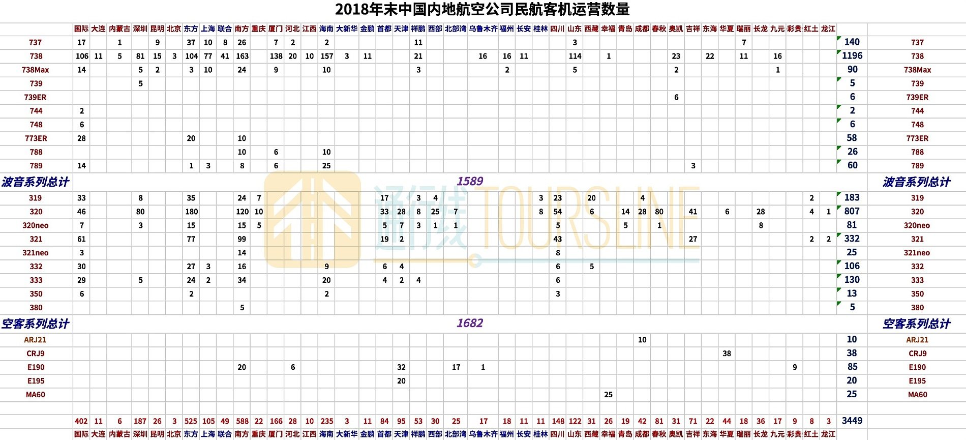 2018年,中国内地民航运输机队规模继续保持高速增长。截止2018年底,中国民航共运营着3449架客机,其中包括1589架波音客机,1682架空客客机,AB两家平分秋色。该数据与2017年底相比,净增331架。