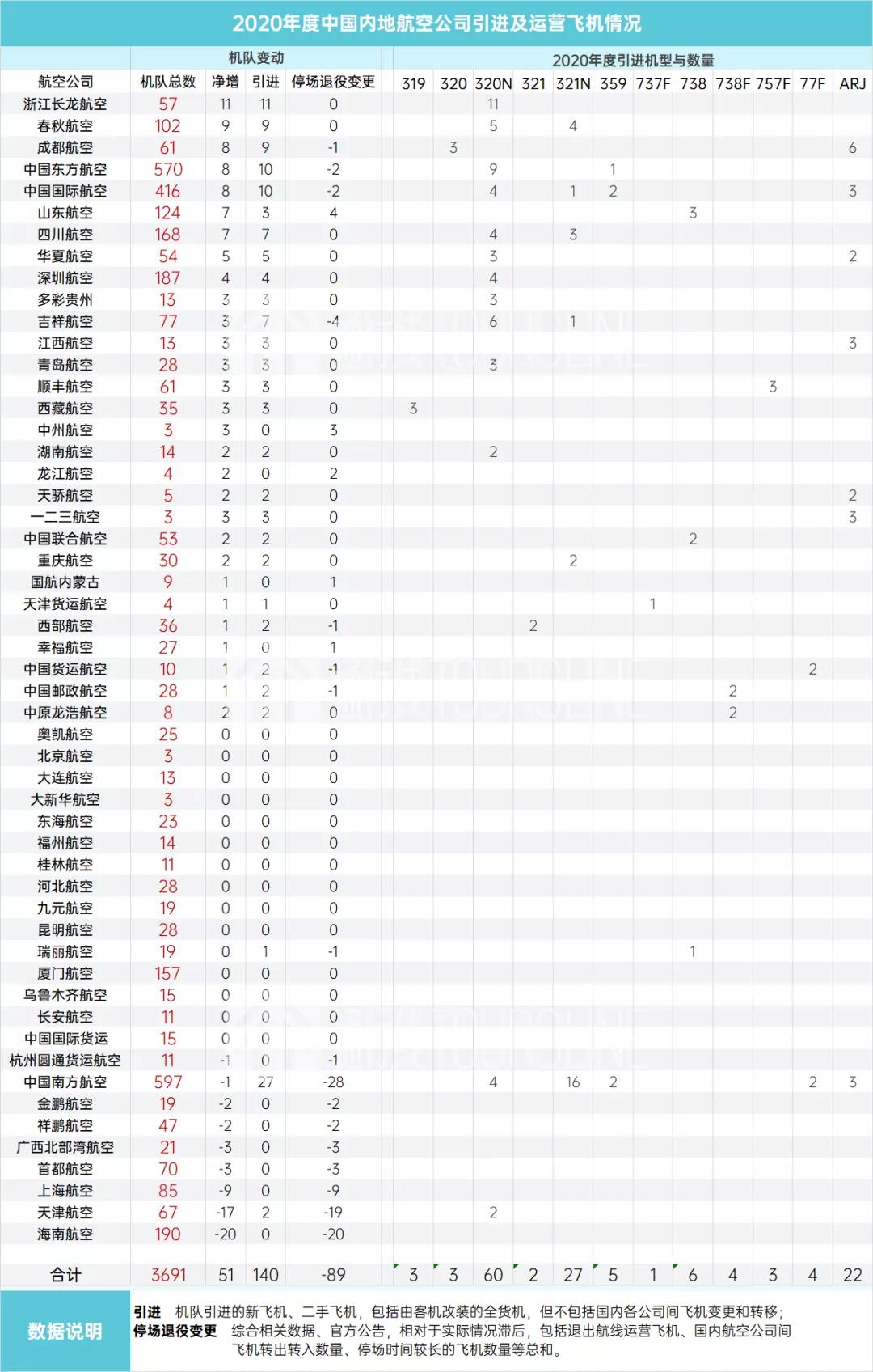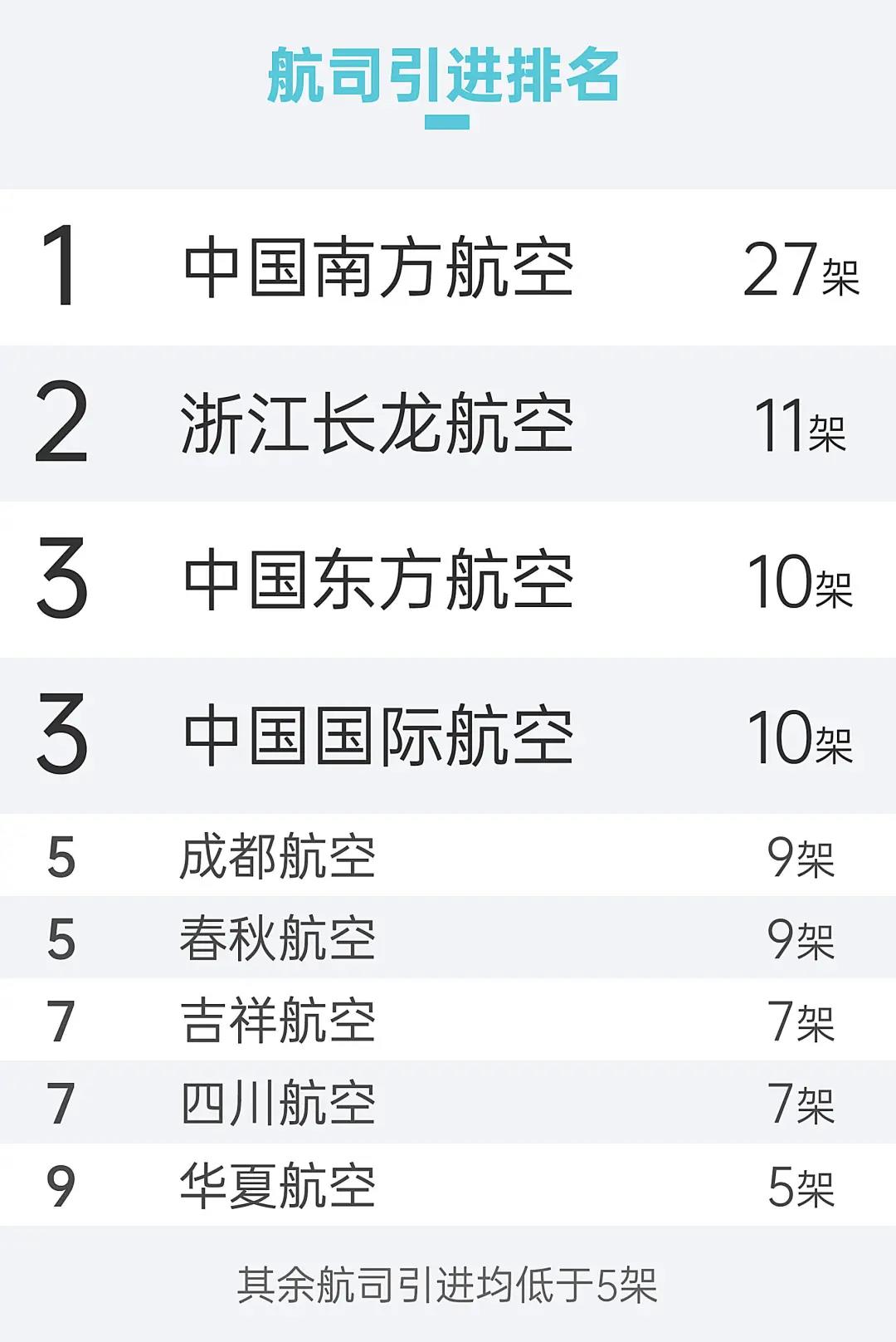 全年,内地投入运营的53家航司中只有28家引进了飞机,合计140架飞机,约为2019年的一半。引进数量最多的仍是中国南方航空,共计27架。其次为浙江长龙航空11架,中国东方航空10架,中国国际航空10架,春秋航空9架,成都航空9架,四川航空7架,吉祥航空7架,华夏航空5架,其余航司引进飞机均不足5架。机队引进数量前十名榜单与2019年差别不大。在疫情爆发初期,由于采取严格的管控措施,新飞机的交付近乎停止。二月份,内地民航飞机引进数量为零,而上一次出现飞机零引进的月份,则要追溯到二十年前的2000年2月。