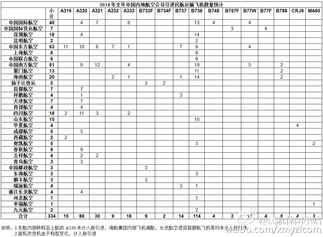 2014年全年中国内地各航空公司引进民航运输飞机数量统计 全年合计引进334架飞机,客机方面@空中客车@波音 旗鼓相当,A320系列133架,B737系列128架,波音宽体客机23架,空客宽体客机25架,货机方面,14架客改货窄体货机,4架宽体货机均为波音,支线客机方面,全年仅引进7架。